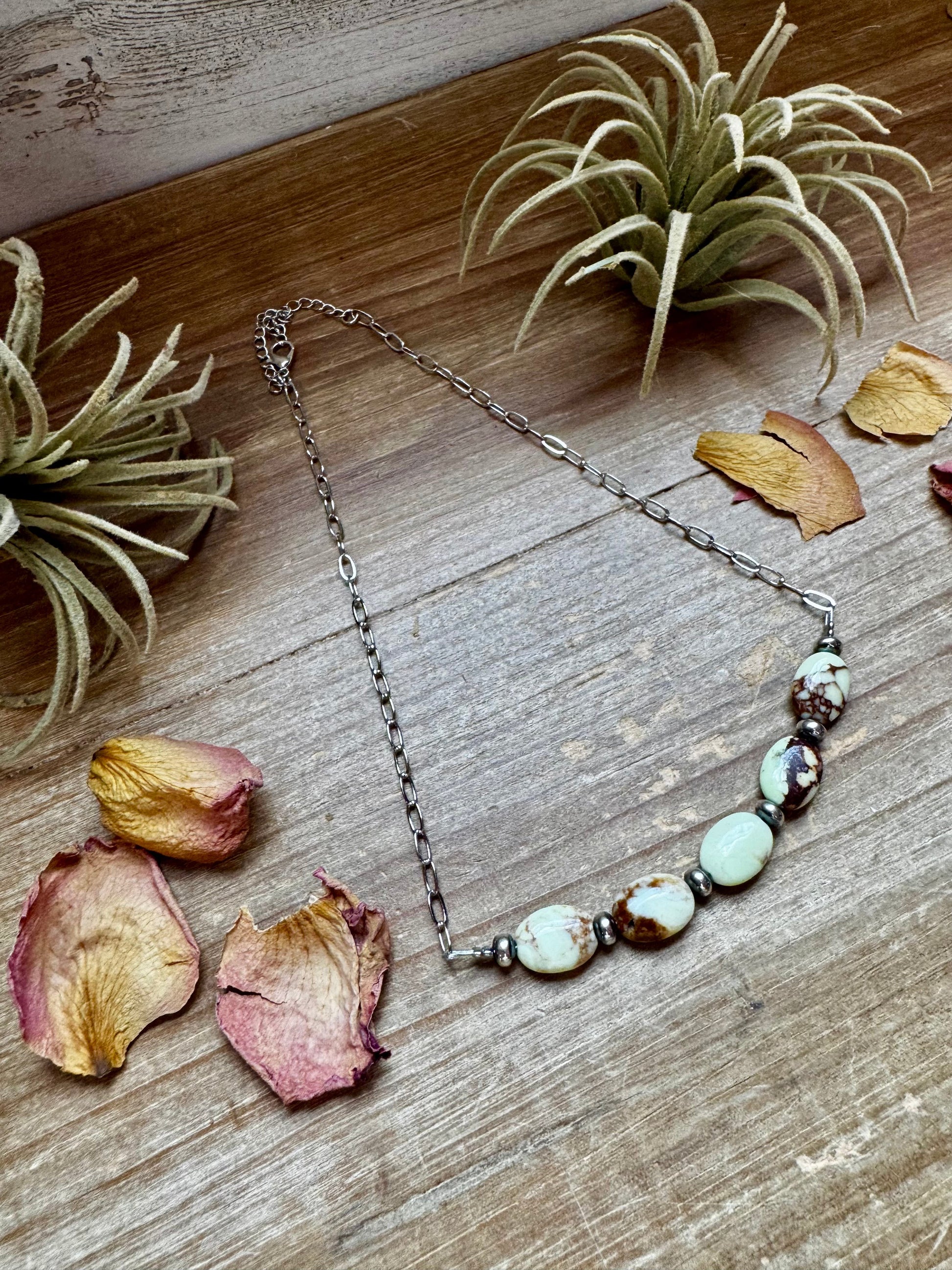 This 15-inch necklace is handmade by us in North Texas, featuring 5mm sterling silver saucer pearls paired with vibrant lemon turquoise magnetite beads, linked on a stylish silver-plated paperclip chain.