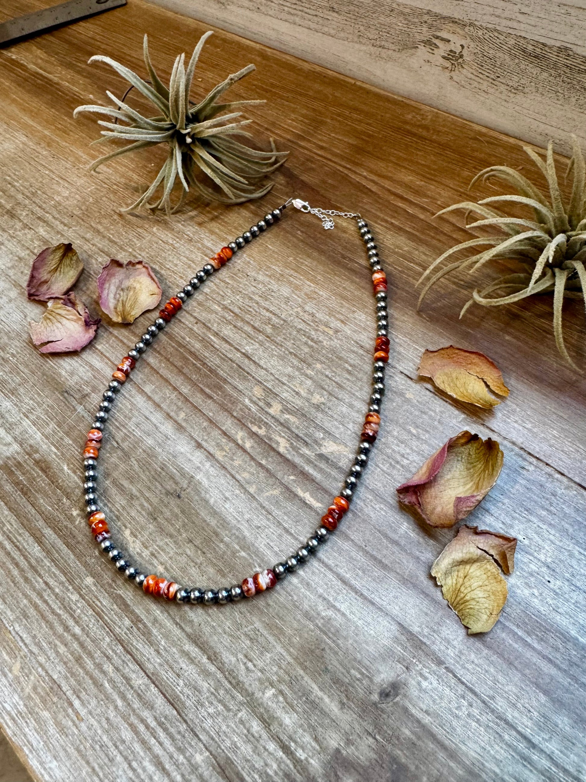 This handcrafted 18-inch necklace features 5mm sterling silver pearls paired with deep orange and red spiny oyster beads for a bold, standout look. A 2-inch sterling silver extender makes it easy to layer and wear daily.