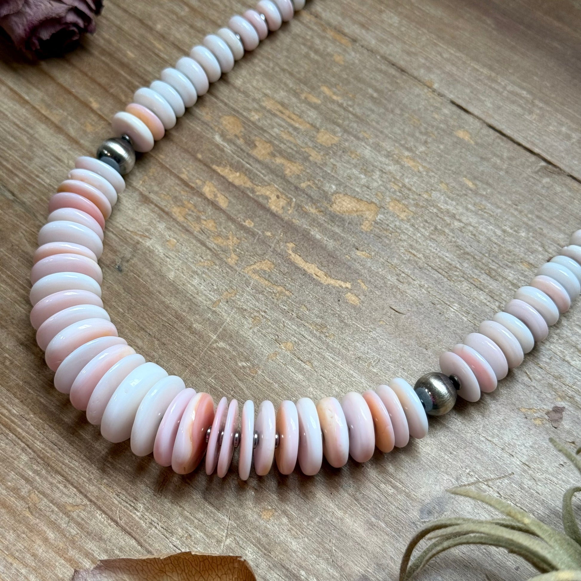 22” Pink Conch Graduated Necklace – Sterling Silver & Hematite