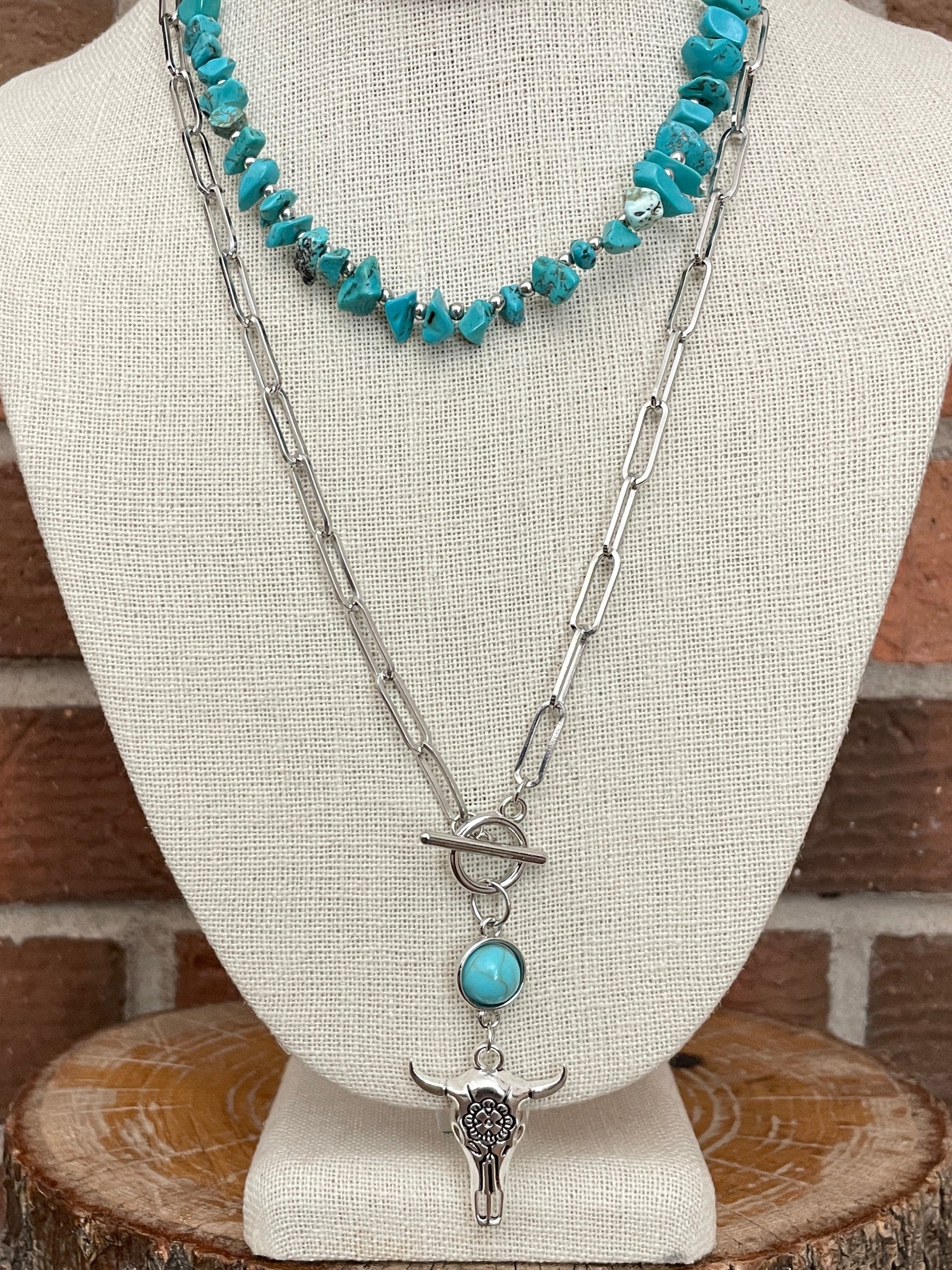 Floral Steer Skull and Turquoise Chip Necklace Set