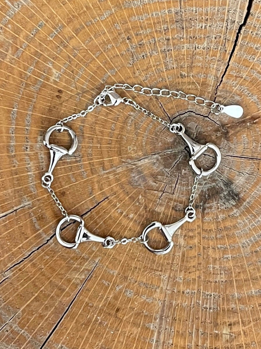 • Four silver-tone cutout half snaffle bit pendants spaced with delicate chain.
