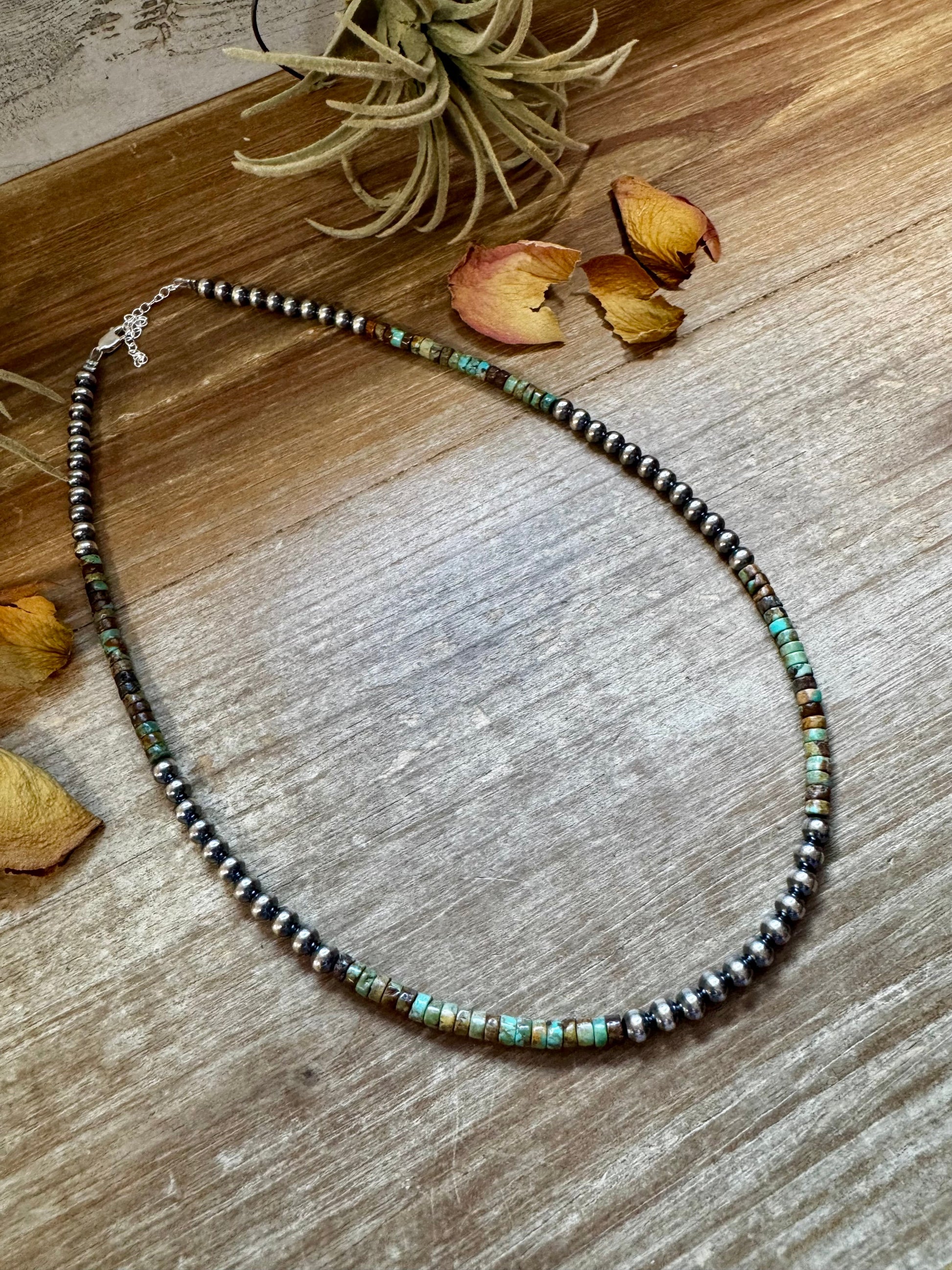 Sterling Silver Pearl & Green Heishi Turquoise Necklace – 19"
