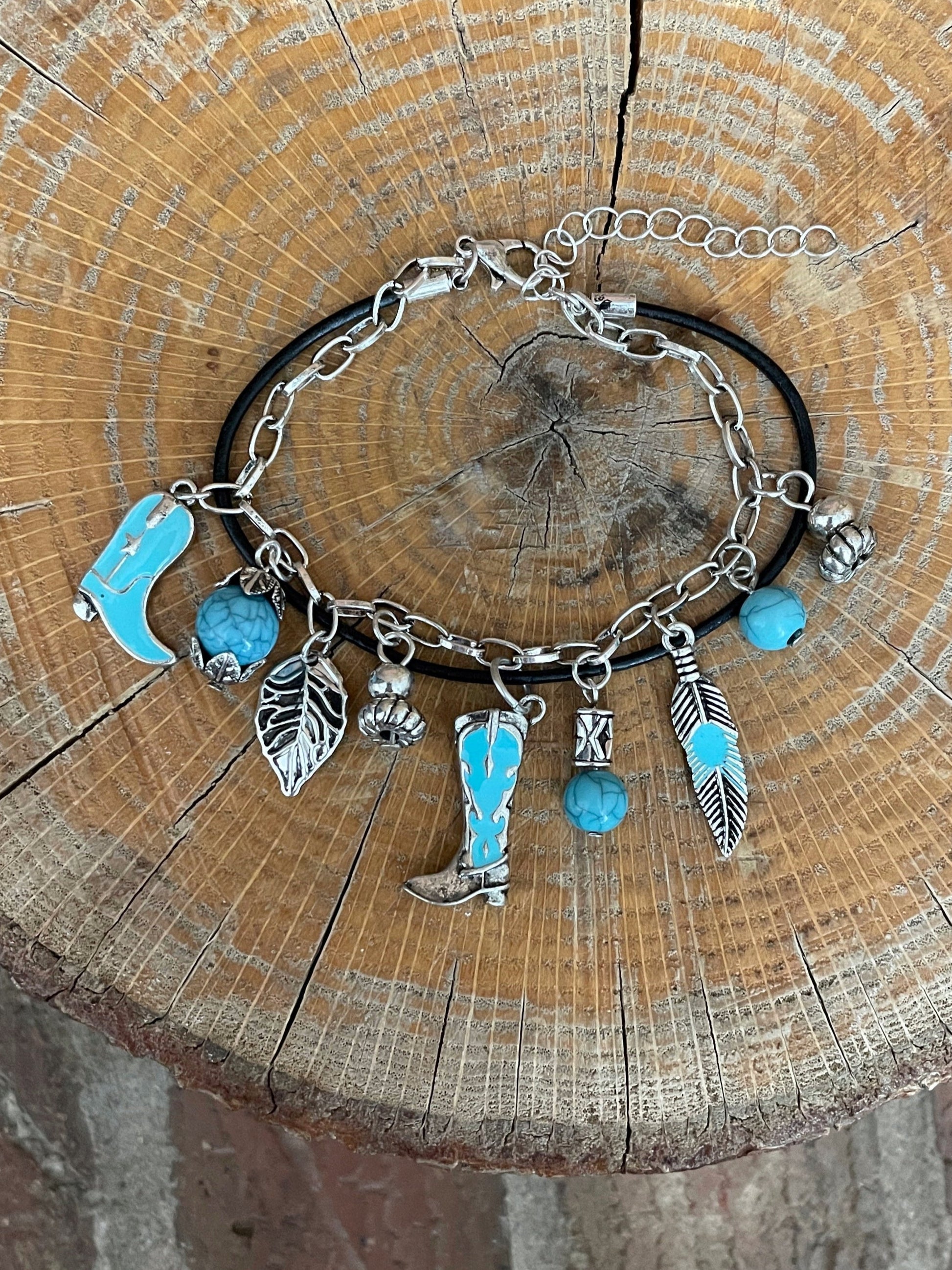 • Charms include an enamel turquoise cowgirl boot, faux turquoise and detailed silver beads, silver feather, large cowgirl boot with turquoise enamel details, and turquoise enamel accented feather.